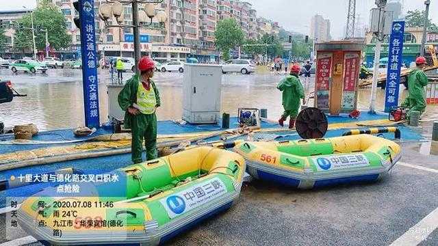 九江市十里大道與德化路十字路口內澇嚴重,積水較深,長江大保護九江項目緊急安排皮劃艇,方便市民通行。