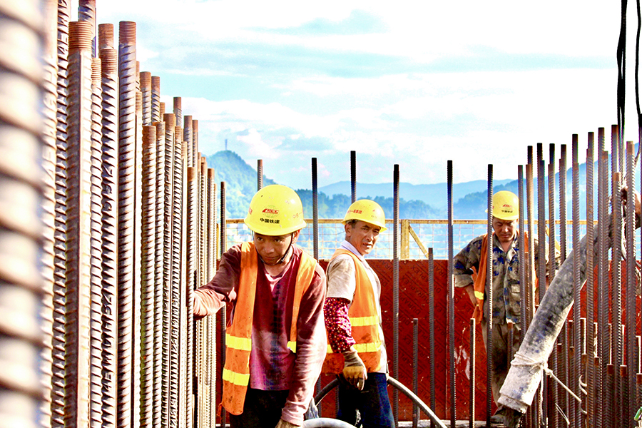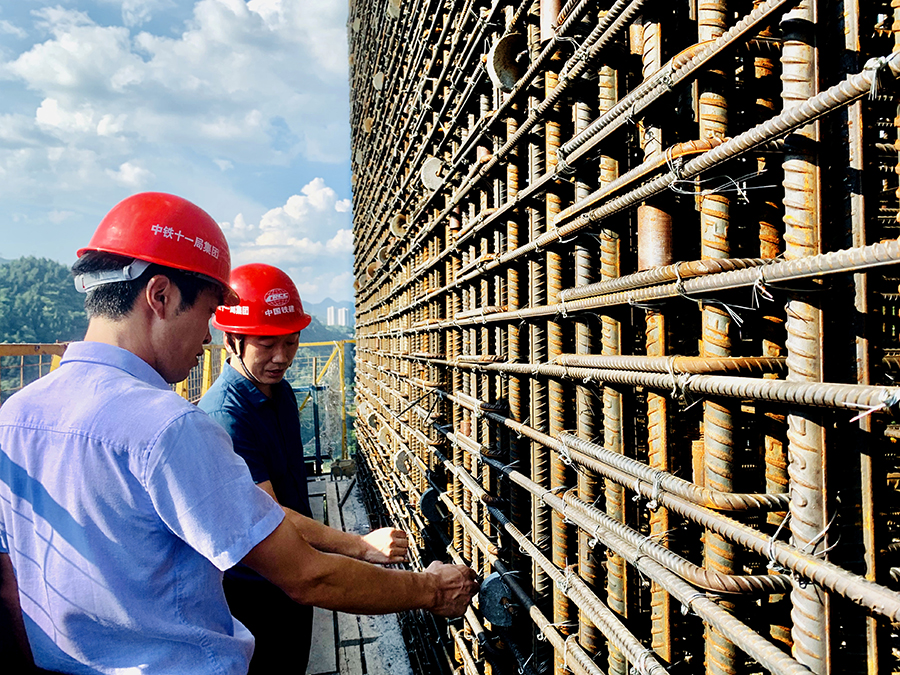 靈活調整(zheng)工(gong)序(xu)作業(ye)。為減少陽光直射面(mian)作業(ye),該項目(mu)制(zhi)定科學合理的作息時間(jian),采(cai)取“抓(zhua)兩(liang)頭,歇中間(jian)”的辦法(fa),有效(xiao)避(bi)開高(gao)溫(wen)時段。圖為烈(lie)日下的項目(mu)部負責人在(zai)百(bai)米(mi)墩身頂部檢查鋼筋籠綁扎(zha)。