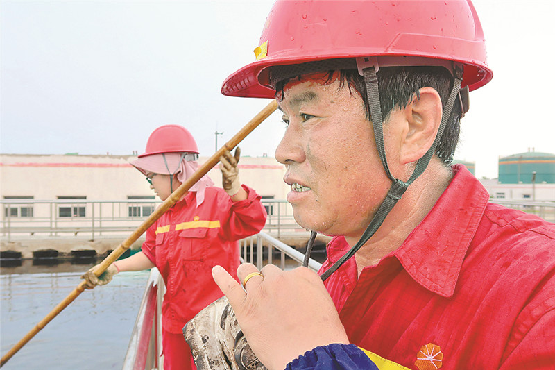 圖為在冀東油田油氣集輸公司高尚堡聯合站生化池收油行動中,有著35年黨齡的共產黨員劉振連揮汗如雨地工作。
