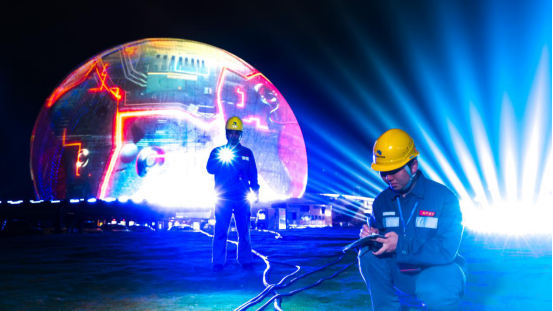 圖為南方電網廣東珠海供電局運維人員在珠海地標建筑物——珠海大劇院的燈光秀現場開展保供電工作。