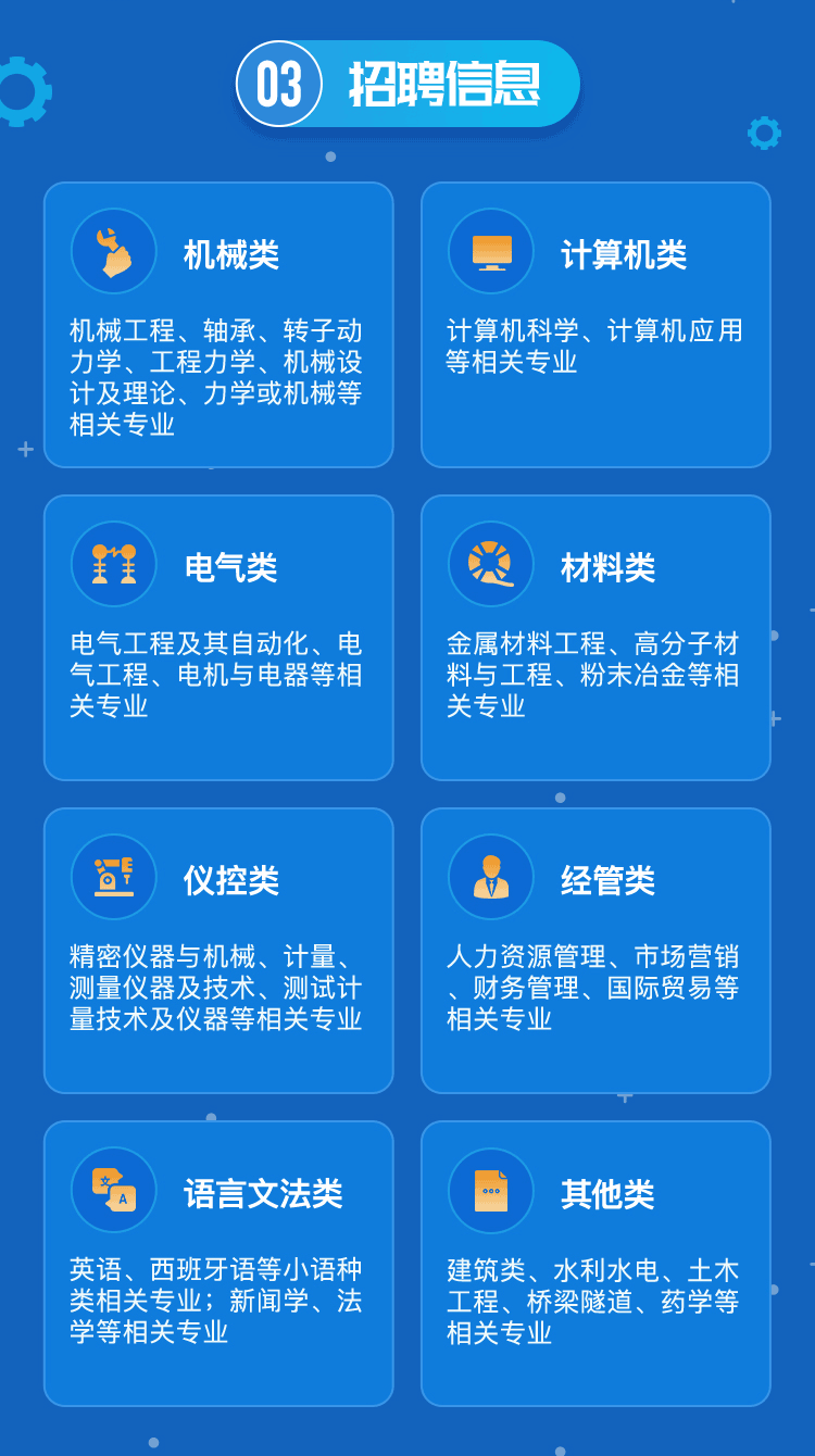 國機(ji)集團面向企業(ye)(ye)未來發展需要,積極響(xiang)應(ying)“六穩(wen)”、“六保”工(gong)作(zuo)精神,深挖用(yong)人(ren)潛(qian)力(li),以實際行動助力(li)應(ying)屆畢業(ye)(ye)生(sheng)就業(ye)(ye),全面啟(qi)動2021校(xiao)(xiao)園招(zhao)(zhao)聘。本(ben)次校(xiao)(xiao)招(zhao)(zhao)涉及(ji)下屬74家(jia)成(cheng)員企業(ye)(ye),提供3000多個工(gong)作(zuo)崗(gang)位,涉及(ji)機(ji)械類(lei)、計算機(ji)類(lei)、電器類(lei)、材料(liao)類(lei)等(deng)多個專業(ye)(ye),工(gong)作(zuo)地點覆蓋全國各大中城市。國機(ji)集團將為優秀高校(xiao)(xiao)畢業(ye)(ye)生(sheng)提供成(cheng)長成(cheng)才的舞臺(tai),讓我們共同建設世界一流企業(ye)(ye),振興(xing)中國機(ji)械工(gong)業(ye)(ye)!