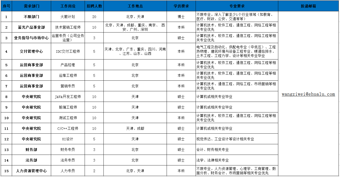本(ben)次招聘以電子郵件方式接(jie)收簡(jian)歷,應(ying)聘者請將個人簡(jian)歷發送至各單位(wei)招聘工作郵箱。