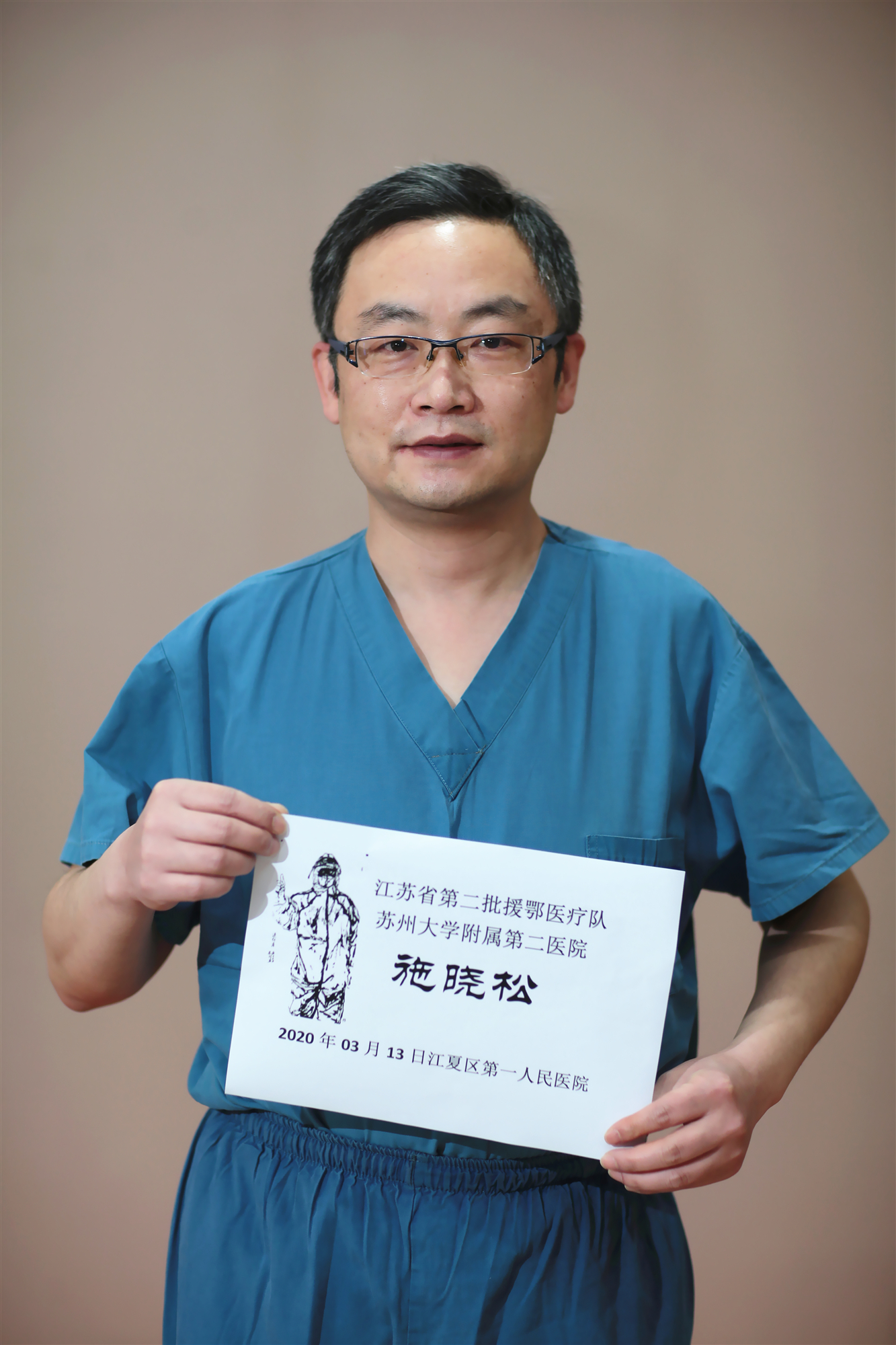 施曉松從大年(nian)三十到(dao)(dao)初(chu)二(er)都在醫(yi)(yi)院工作(zuo)(zuo),沒(mei)有(you)(you)休息(xi)一天。 1月26日(ri)(大年(nian)初(chu)二(er))深夜11點多接到(dao)(dao)指(zhi)令,需要增(zeng)加一名醫(yi)(yi)院感(gan)染管理專業高級職(zhi)稱的醫(yi)(yi)務人員加入醫(yi)(yi)療隊赴湖(hu)北抗疫一線(xian),聽(ting)到(dao)(dao)這個消息(xi),施曉松第(di)一時間(jian)毛遂自薦(jian)。“作(zuo)(zuo)為一名有(you)(you)著20多年(nian)黨齡的老黨員,作(zuo)(zuo)為醫(yi)(yi)院感(gan)染管理處處長,作(zuo)(zuo)為一名醫(yi)(yi)務工作(zuo)(zuo)者,抗擊疫情是(shi)我的責任(ren)和使命。”