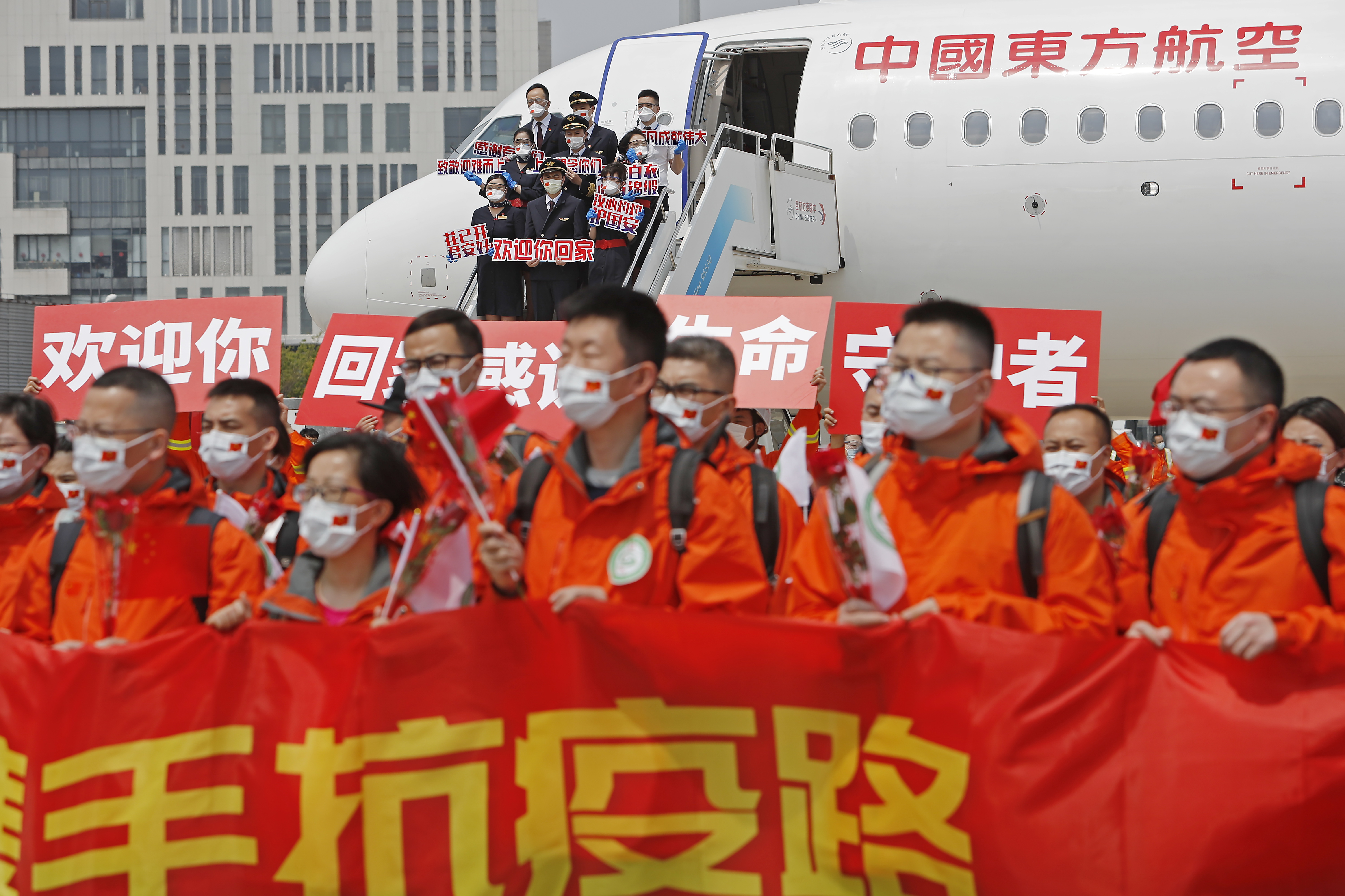 2020年4月10日,東航護送最后一批上海援鄂醫療隊返滬。在上海虹橋機場,東航上海飛行部何超機組站在舷梯上歡迎醫療隊凱旋。