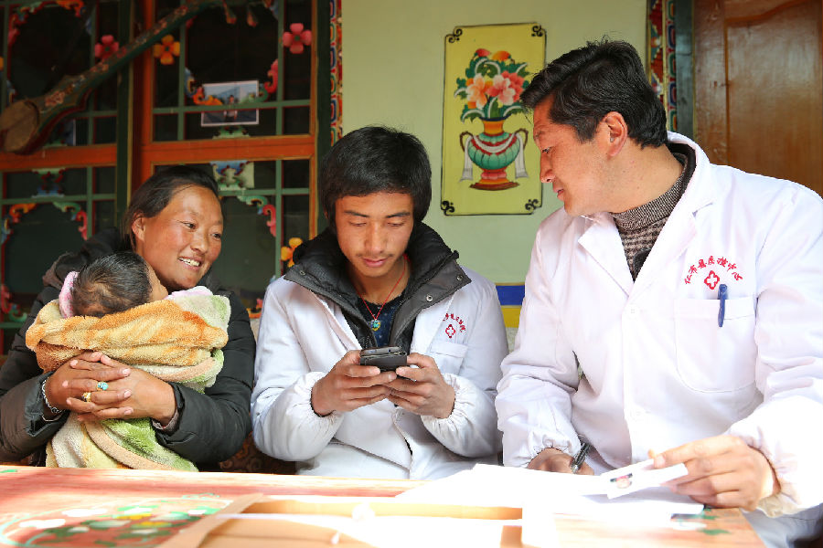 2016年7月,西藏日喀則地區仁布縣姆鄉衛生員旦增赤列(中)走村入戶,利用中國移動西藏公司“全員人口信息移動智能終端采集”系統錄入各村新生嬰兒人口信息。
