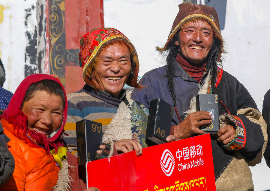 2019年,在西藏措勤縣,藏族群眾領取中國移動捐贈自主品牌藏語手機A6。
