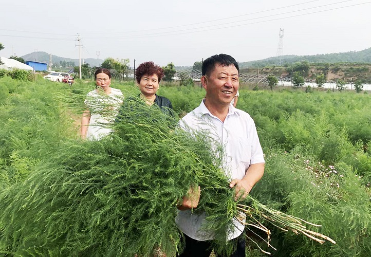 中國鐵建所屬中鐵十七局駐山西省汾西縣勍香村扶貧隊員與村民共同收割第一茬蘆筍。