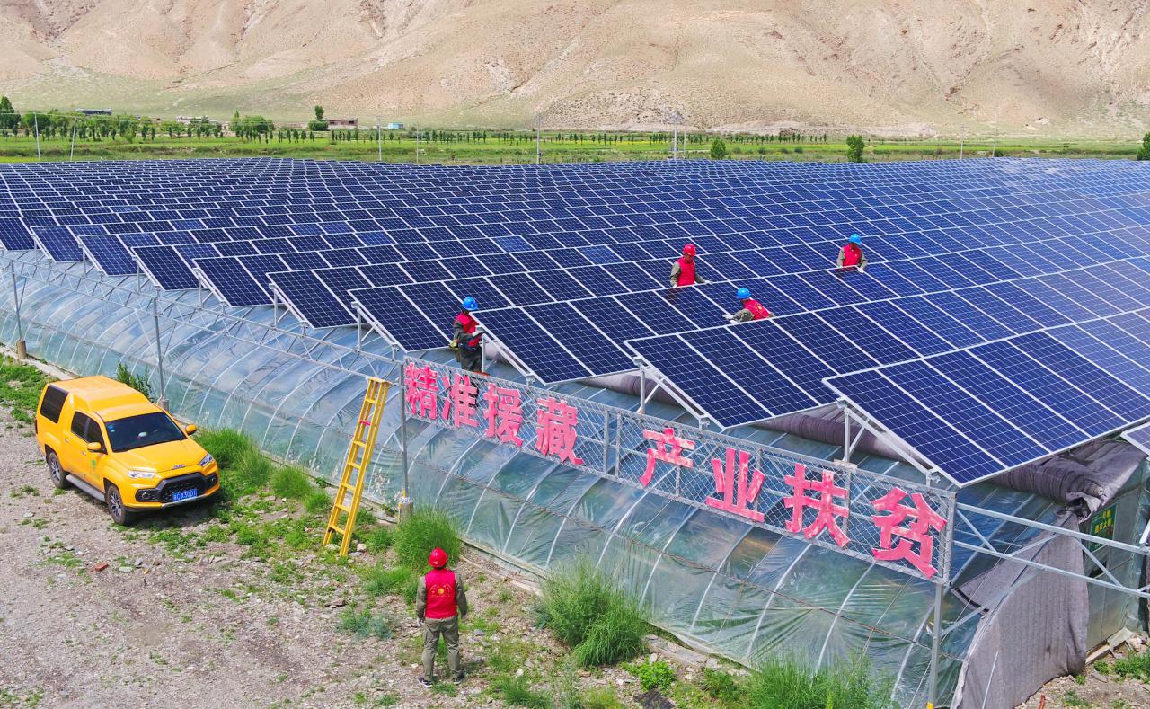 援藏幫扶工作人員在西藏山南市瓊結縣拉玉鄉維護“農光互補”光伏發電設備。
