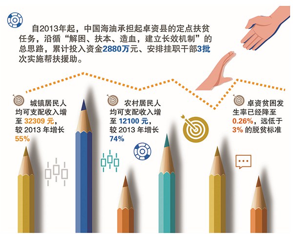 3月4日,經內蒙古自治區人民政(zheng)府批準,中國(guo)海(hai)油(you)對口幫(bang)扶(fu)地內蒙古卓資縣正(zheng)式退出貧(pin)困縣序列。至此(ci),中國(guo)海(hai)油(you)對口幫(bang)扶(fu)的6個縣市全部脫貧(pin)摘帽。