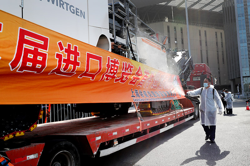 10月23日,工作人員在對進博會首件進場展品及運載卡車進行噴霧消毒。