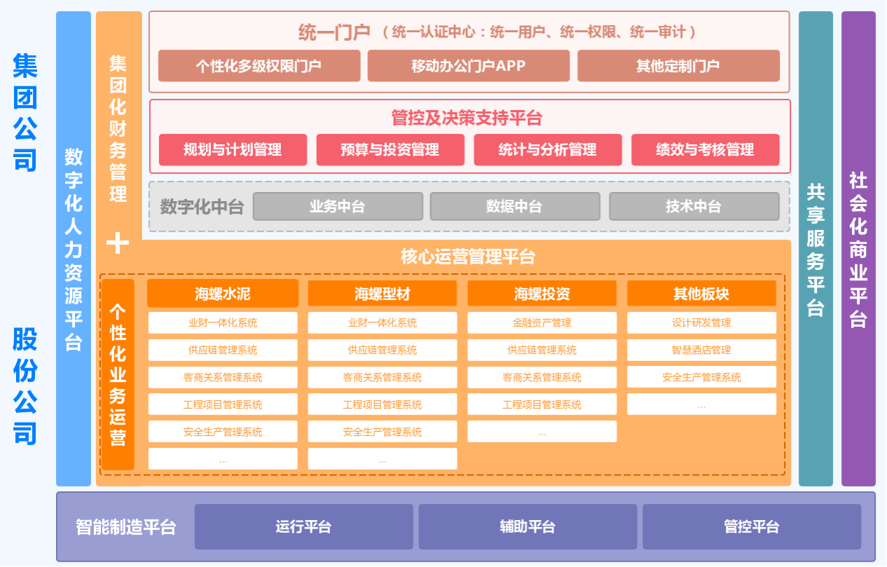 過去(qu)的幾年,海螺集團按(an)照數(shu)(shu)字(zi)(zi)化(hua)轉型總體規劃要(yao)求,優先重點建設(she)智(zhi)能制造平(ping)(ping)臺和核心運營管理平(ping)(ping)臺,分步建設(she)共(gong)享(xiang)服務平(ping)(ping)臺、社會(hui)化(hua)商(shang)業平(ping)(ping)臺、數(shu)(shu)字(zi)(zi)化(hua)人(ren)力(li)資(zi)源平(ping)(ping)臺和管控與(yu)決策支(zhi)持平(ping)(ping)臺,在(zai)數(shu)(shu)字(zi)(zi)化(hua)轉型發(fa)展上走出了(le)一條堅實的道路(lu)。