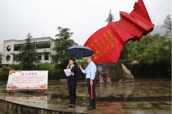 在東汽廠區地震遺址,東汽職工陳鳳結合黨史學習教育,現場動情講述東汽災后重建的感人故事。