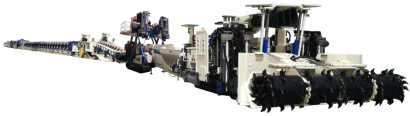 【技術產品簡介】以一次采全高方式開采8-9m特厚煤層,具有生產效率和回采效果高的突出優點。8-9m特厚煤層采煤機是該厚度煤層綜采成套設備中的關鍵裝備,承擔著割煤和裝煤的重要任務。該系列采煤機最大裝機功率3450kW,整機重量200-230t,具備智能化采煤功能,具有年產1500萬噸以上的生產能力,創最大采高和裝機功率兩大世界紀錄。