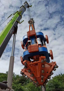 【技術產品簡介】導井式豎井掘進機是國內首臺套具有自主知識產權,利用反井鉆孔作為導井的大型綜合鑿井裝備。創新形成了“整體框架導向、多點支撐、變頻電機驅動、行星加單級減速、四油缸推進、錐形鉆頭破巖和超前鉆頭糾偏”的豎井掘進機整體結構,通過光纜或網絡能夠實現遠程控制,減少井下作業人員。其涉及巖石破碎、機械加工、電氣傳動、液壓控制、傳感器測量、數字控制等多學科,用機械破巖代替傳統的鉆眼爆破破巖,能夠實現破巖、出渣、支護平行作業,鉆鑿直徑5.8-6.0m、深度800m-1000m的豎井井筒,具有機械化程度高、不需爆破作業、井下人員少、施工效率高、成井質量好、安全性高等優點。