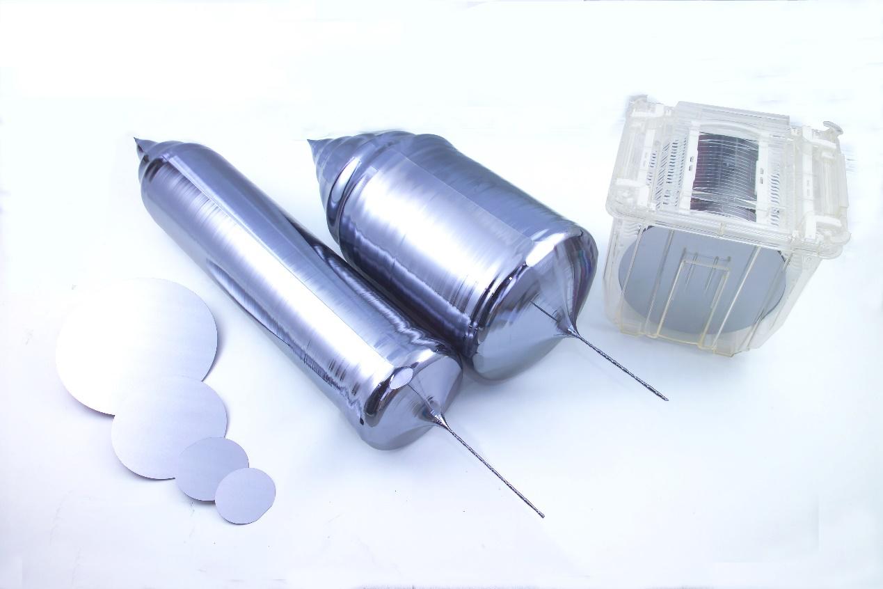 2012年3月12日,北京有(you)色金屬研究總院建成中國第一條8"硅(gui)(gui)片(pian)(pian)生產線、12"硅(gui)(gui)片(pian)(pian)中試(shi)生產線。圖為單晶與硅(gui)(gui)片(pian)(pian)。(來源(yuan):有(you)研集團)
