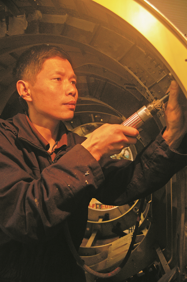 “人家(jia)都(dou)在(zai)(zai)休(xiu)息時,我(wo)就在(zai)(zai)琢磨白天學到的(de)(de)技(ji)(ji)術,一(yi)邊琢磨一(yi)邊練習(xi)。”劉時勇說。他進(jin)廠時,廠里(li)正在(zai)(zai)造殲(jian)7系列(lie)飛機,任何(he)一(yi)個零(ling)件、任何(he)一(yi)個部件都(dou)不允許出錯,技(ji)(ji)術要(yao)(yao)求很高。那時只要(yao)(yao)完成了手頭的(de)(de)工作,劉時勇就自己找(zhao)鉚釘、找(zhao)板(ban)材(cai)(cai)不斷練習(xi),有時也利用報廢的(de)(de)零(ling)件來(lai)練手。“除了吃飯睡覺都(dou)在(zai)(zai)練,在(zai)(zai)不斷重(zhong)(zhong)復(fu)的(de)(de)劃線、鉆孔和(he)鉚槍單調的(de)(de)刺耳聲中(zhong)尋(xun)找(zhao)優質高速的(de)(de)辦法,在(zai)(zai)拆卸和(he)鉚裝的(de)(de)重(zhong)(zhong)復(fu)過程中(zhong)尋(xun)找(zhao)創新(xin)的(de)(de)技(ji)(ji)藝(yi),在(zai)(zai)新(xin)的(de)(de)理(li)論(lun)與材(cai)(cai)料、工具的(de)(de)操作上(shang)尋(xun)找(zhao)與工友們共同進(jin)步的(de)(de)路徑。”