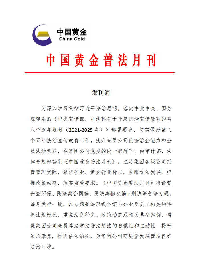 為深入貫徹落實習近平生態文明思想和習近平法治思想,落實習近平總書記“用最嚴格制度最嚴密法治保護生態環境”的要求,提高中國黃金集團公司依法治企能力和全員法治素養,把生態環境保護理念貫穿到發展各領域全過程,集團公司編制印發《中國黃金普法月刊》,月刊從企業實際出發,聚焦礦業、黃金行業特點,緊跟立法發展、政策動態與監管要求,用法治思維和方式推進落實中央生態環境保護督察整改工作。