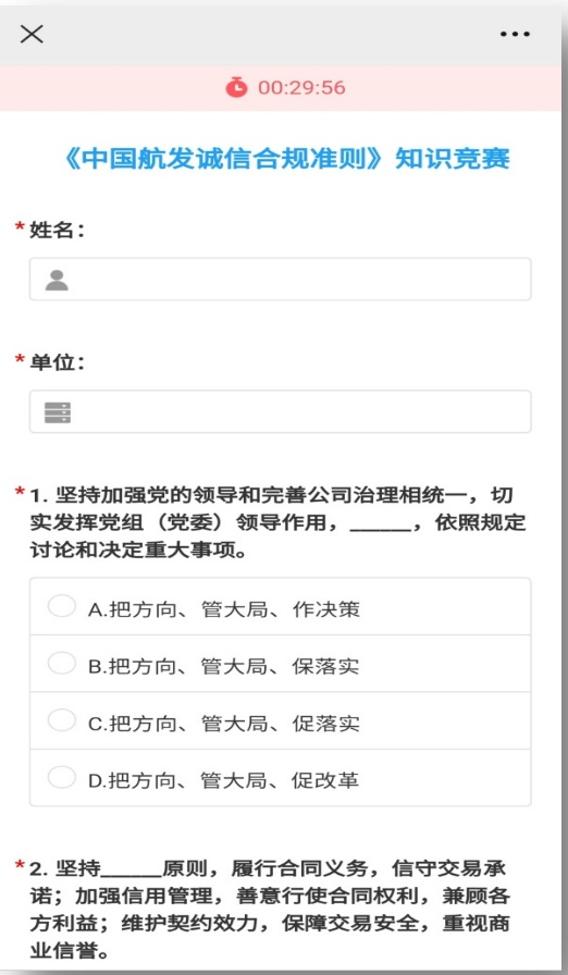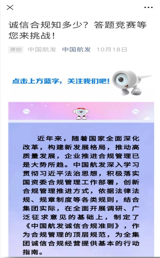 中國(guo)航發(fa)深入學習(xi)貫徹(che)習(xi)近(jin)平法治思想,積(ji)極(ji)落實國(guo)資委合(he)(he)規(gui)管(guan)理工(gong)作(zuo)部署,制定(ding)發(fa)布《誠(cheng)信合(he)(he)規(gui)準則》,作(zuo)為集團(tuan)合(he)(he)規(gui)管(guan)理頂層(ceng)規(gui)范。近(jin)日,為加大宣傳力度(du),引導全(quan)員樹立誠(cheng)信合(he)(he)規(gui)理念、踐(jian)行(xing)誠(cheng)信合(he)(he)規(gui)要求,在全(quan)集團(tuan)開(kai)展了《準則》網(wang)上答題競賽活動,活動歷時(shi)14天,共有11.72萬人(ren)次(ci)參與答題。