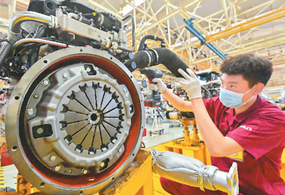 4月27日,工人在位于山東省青州市的江淮汽車山東分公司總裝車間內組裝生產。