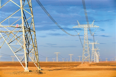 ±1100千伏準東—皖南特高壓直流輸電工程是我國自主研發的世界電壓等級最高、輸電容量最大、輸電距離最遠的特高壓工程,刷新了世界電網技術紀錄。圖為工程新疆段。資料照片