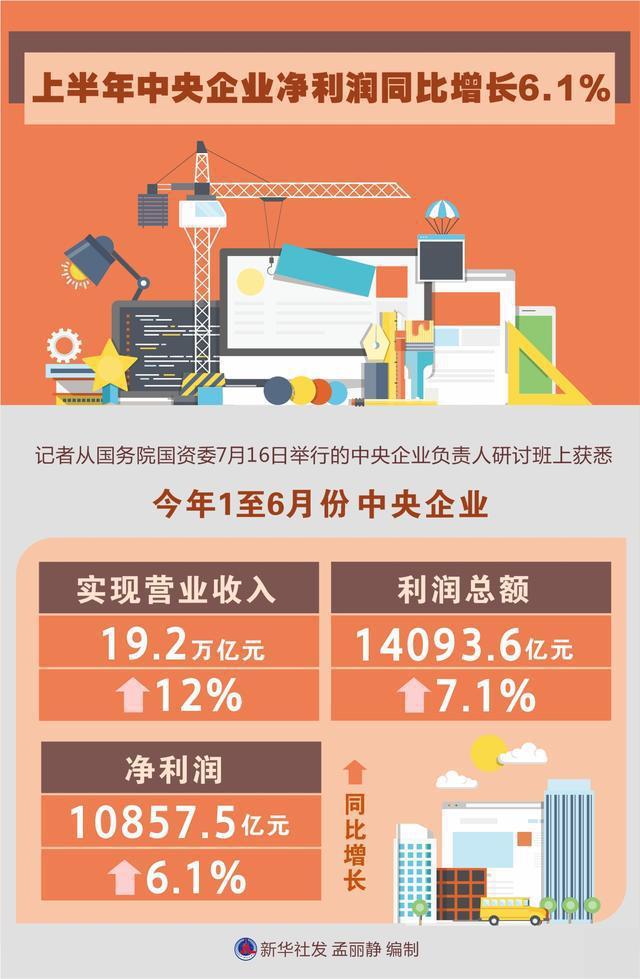 新華社北京(jing)7月(yue)16日(ri)電(dian) 記者從國務院(yuan)國資委16日(ri)舉行的中央企業(ye)負(fu)責人(ren)研討班上獲悉(xi),今年1至6月(yue)份,中央企業(ye)實現營業(ye)收入19.2萬億(yi)元(yuan)、利潤總額14093.6億(yi)元(yuan)、凈利潤10857.5億(yi)元(yuan),同比(bi)分(fen)別增長12%、7.1%、6.1%。