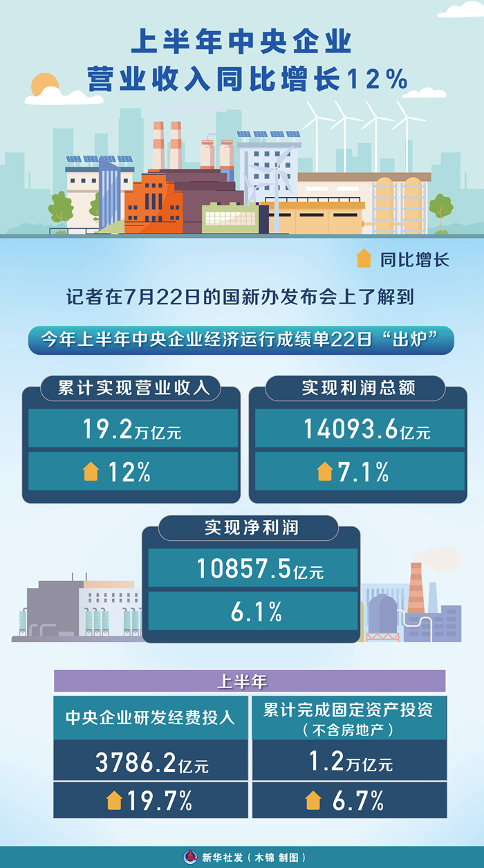 新華(hua)社北京7月22日(ri)電 今年(nian)(nian)上半年(nian)(nian)中(zhong)央企業(ye)經濟(ji)運(yun)行成(cheng)績單22日(ri)“出(chu)爐”:累計實現(xian)(xian)營(ying)業(ye)收入19.2萬億元,同(tong)比(bi)增長12%;實現(xian)(xian)利(li)潤總額14093.6億元,同(tong)比(bi)增長7.1%;實現(xian)(xian)凈利(li)潤10857.5億元,同(tong)比(bi)增長6.1%。