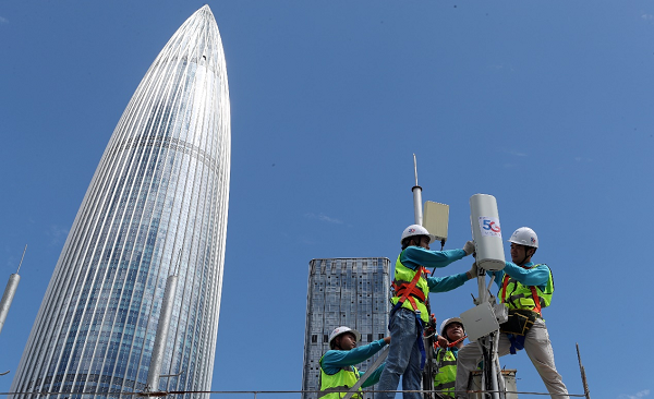 2020年9月,中國電信深圳分公司工作人員正在深圳“春筍”大樓附近部署5G網絡,賦能數字經濟發展