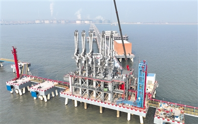 2023年1月4日,工人在唐山市曹妃甸區新天LNG(液化天然氣)項目接收站碼頭施工(無人機照片)。