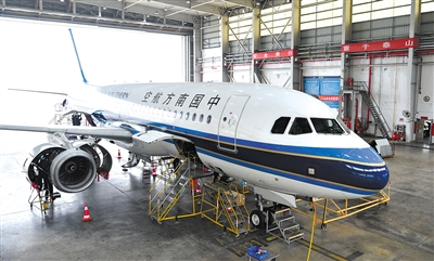 2023年1月5日,在位于海南省海口市的中國南方航空美蘭基地機庫,工程師在對飛機進行檢修。