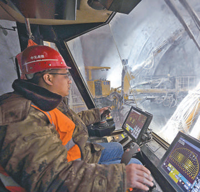 首都地區環線高速公路承德至平谷段楊家窩鋪特長隧道施工現場,工人在操作機械進行鉆孔。