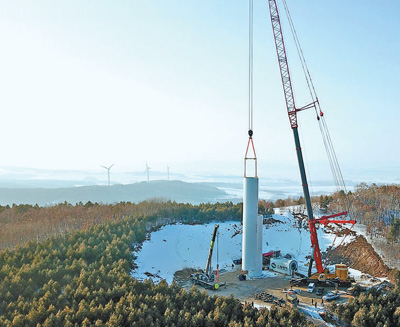 華電黑龍江區域哈爾濱依蘭雞冠山風電場三期工程風電機組吊裝現場。