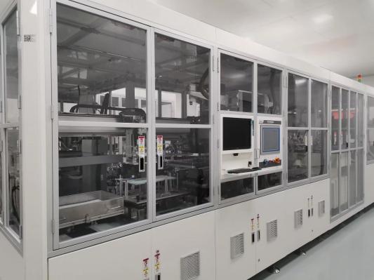 2.膜電極生產線:開發卷料裁切設備、邊框封裝設備、七合一膜電極制成設備和下線檢測設備,采用高精度激光裁切、“卷對卷”邊框復合、CCD視覺檢測、狀態記錄與信息采集等先進技術,建成年產能72萬片全自動化膜電極柔性生產線,可兼容行業主流膜電極產品自動化生產,生產節拍大于3片/分鐘,零部件國產率95%以上。