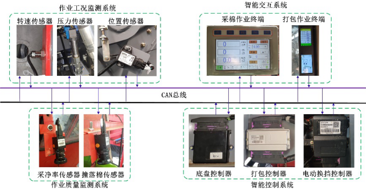 圓包式采棉機智能控制系統突破了圓模成型工藝流程、智能控制等核心技術,完善了作業狀態監控、故障診斷與報警等共性關鍵技術,基于嵌入式測控技術和CAN( Controller AreaNetwork)總線技術開發了圓模成型控制器、狀態監控控制器、智能監控顯示儀、柱式顯示儀,集成研制了具有自主產權的圓模式采棉機智能控制系統,實現了智能控制技術及系統的自主自立,在河北、山東、新疆等地進行了田間搭載試驗與應用,經過第三方鑒定,技術指標達到考核指標要求,顯著提升了采棉機的智能化水平和作業效率,相關的技術研究成果(關鍵技術和控制系統)在圓包式三行采棉機上得到了產業化推廣應用,累計應用48臺套。