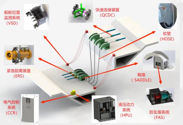 LNG輸送與轉駁系統是海上LNG產業鏈的關鍵核心系統之一,是用于實現LNG加注終端與LNG受注終端之間LNG貨物輸送與轉駁系統裝置,實現LNG海上安全快速輸送。系統主要包括:軟管、船船快速連接/分離裝置、主動緊急脫離裝置、軟管鞍座、防墜落系統、軟管鞍座、液壓動力單元、電氣控制系統。