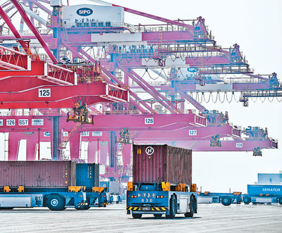 洋山深水(shui)港(gang)(gang)(gang)四期(qi)(qi)工程(cheng)項目總用(yong)地面積達到2.23平方公里,前(qian)期(qi)(qi)的(de)基(ji)建工程(cheng)由中建港(gang)(gang)(gang)務(wu)、中交上海(hai)航道局、中交三航局聯手完(wan)成。洋山四期(qi)(qi)擁有2350米的(de)岸線(xian),一(yi)次(ci)性建成7個泊位。今年(nian)年(nian)底開港(gang)(gang)(gang)后,將(jiang)形成400萬(wan)標箱(xiang)(xiang)/年(nian)的(de)吞(tun)吐能力。后期(qi)(qi)繼續擴大規(gui)模,吞(tun)吐量(liang)將(jiang)達到630萬(wan)標箱(xiang)(xiang)/年(nian)。圖(tu)為(wei)7月(yue)25日,自動導引運輸(shu)車在上海(hai)洋山深水(shui)港(gang)(gang)(gang)四期(qi)(qi)工程(cheng)碼頭調試運行。