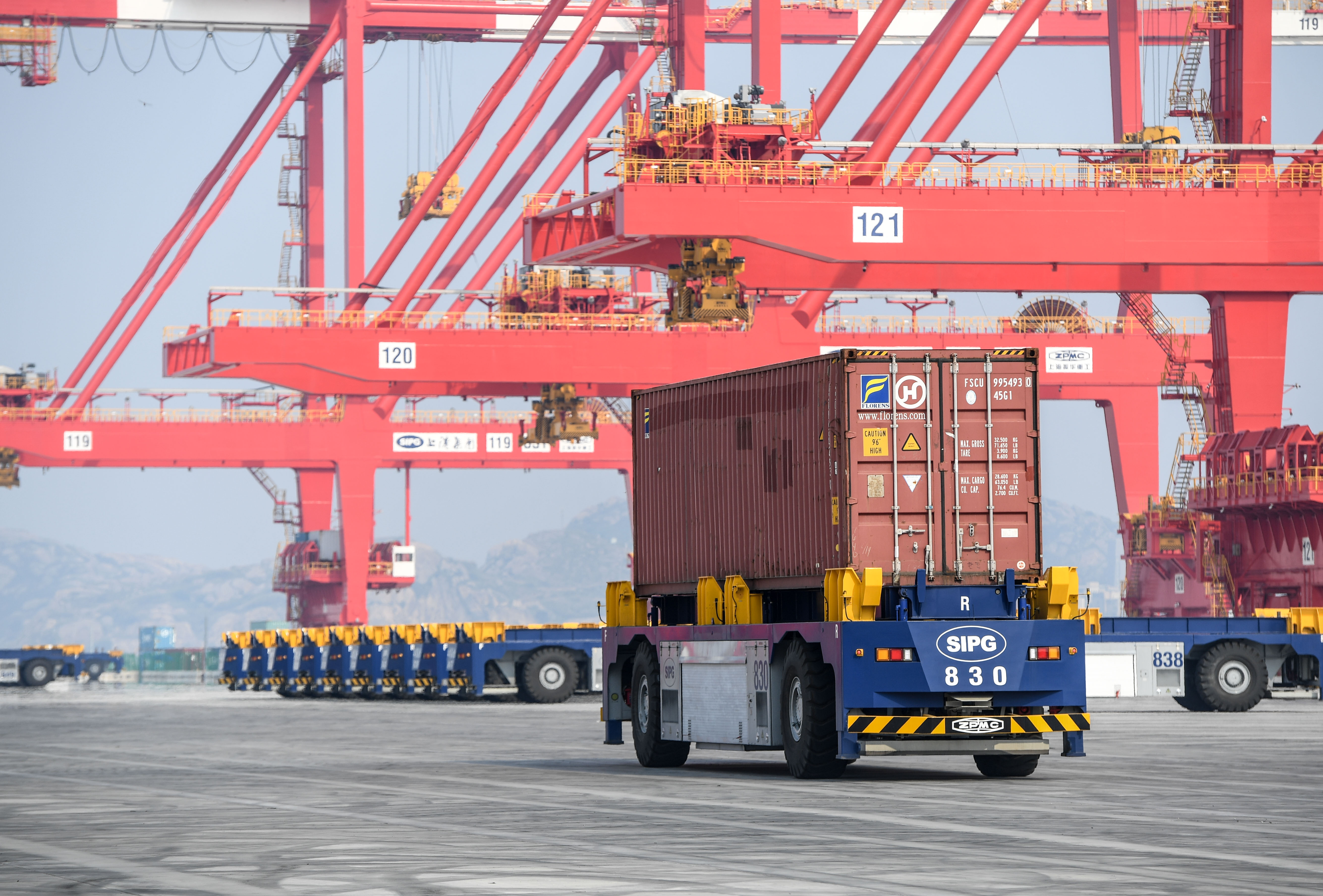 7月25日,AGV(自動導引運輸車)在上海洋山深水港四期工程碼頭調試運行。