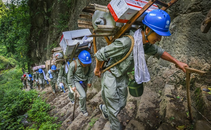 湖北省(sheng)長陽縣,土家電(dian)(dian)工用背架運送(song)村村通動(dong)力電(dian)(dian)材料