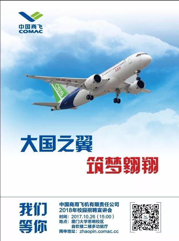 中國(guo)商(shang)飛公司2018年(nian)校(xiao)園招(zhao)聘(pin)自9月7日啟動以來(lai),宣講(jiang)團隊已(yi)走過全國(guo)十(shi)個(ge)城(cheng)市的11所(suo)知名高(gao)校(xiao),收(shou)到了廣大師(shi)生們的熱烈歡(huan)迎,校(xiao)招(zhao)宣講(jiang)會即將(jiang)迎來(lai)尾聲,最后一站廈門(men)大學。