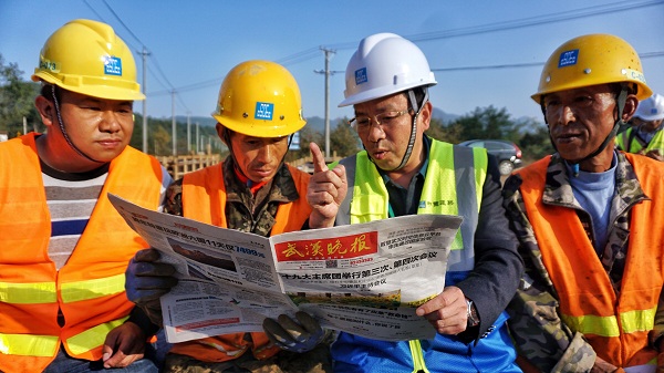 中建三局一公司黃陂旅游公路項目聯合黨支部副書記分發報紙給工友們,并用淺顯易懂的語言,向他們講解與他們切身利益相關的會議精神。