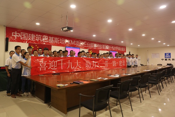 中建七局交通公司巴基斯坦PKM項目部全體管理人員在題為“喜迎十九大,助力‘一帶一路’建設”的橫幅上簽名。
