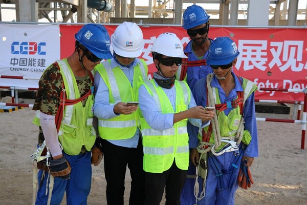 10月24日,中國能建天津電建迪拜哈翔項目部員工利用休息間歇用手機關注十九大動態。