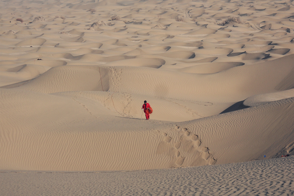 作品說明:中石(shi)化勘探人員在塔克拉瑪(ma)干沙(sha)漠進行地震勘探,圖為(wei)放線人員進行施(shi)工作業。
