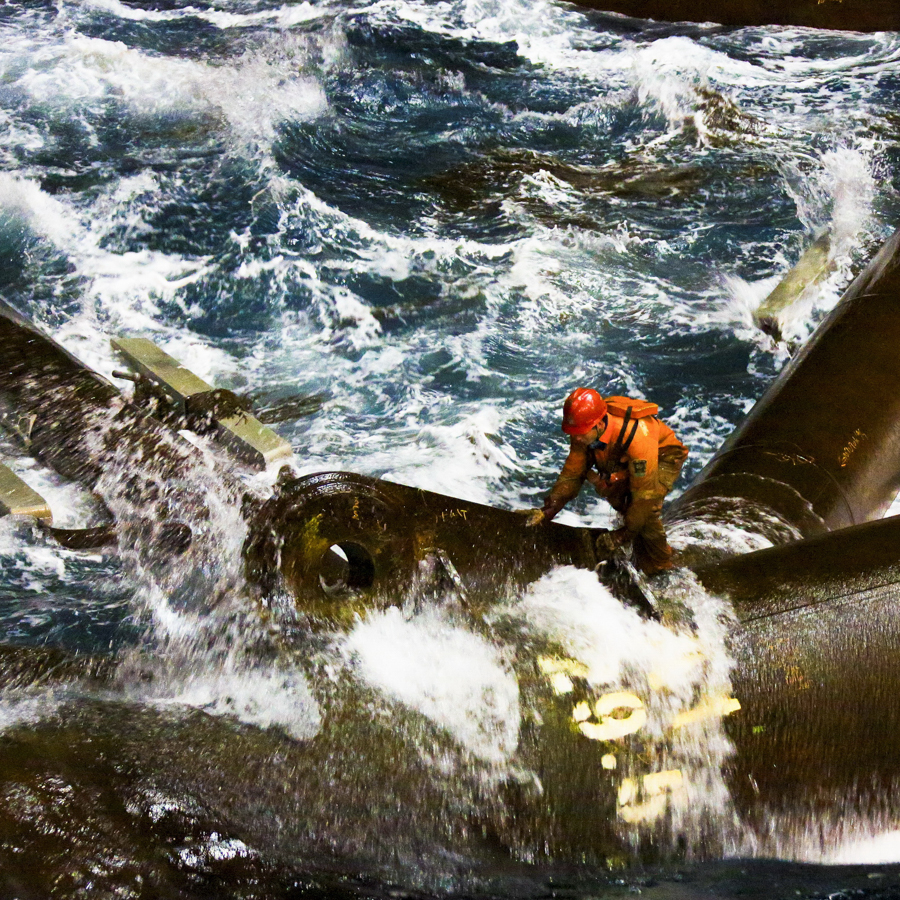 作品說明:2015年(nian)3月,我國某(mou)海(hai)域海(hai)上采油平(ping)臺導管架(jia)海(hai)上安(an)裝現場,潛水員正(zheng)在為導管架(jia)的(de)扶正(zheng)吊裝做準備工作,年(nian)輕的(de)潛水員時而(er)被冰冷的(de)海(hai)水淹沒,寒冷和涌(yong)浪(lang)是(shi)對他(ta)(ta)們身體和意志的(de)考驗(yan),但他(ta)(ta)們毫不(bu)畏懼艱難。