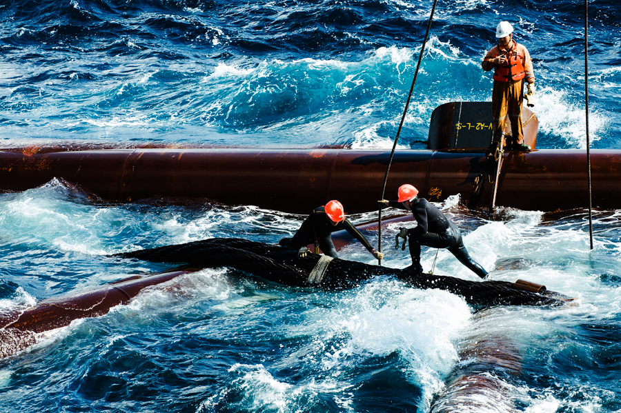 作品說明:導管架海(hai)上(shang)安裝受惡劣天(tian)氣(qi)影響,吊裝鋼纜的(de)液壓卡環不能自動解(jie)壓,為(wei)保證項目(mu)安全平穩進(jin)行(xing),潛(qian)水員下水進(jin)行(xing)人工(gong)解(jie)纜。寒風(feng)刺骨,海(hai)水冰冷,潛(qian)水員經過(guo)一個多1小時的(de)努力,終(zhong)于成(cheng)功解(jie)纜,為(wei)項目(mu)施工(gong)贏得(de)了寶貴的(de)時間。