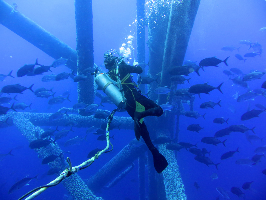 作品說明:潛水員正潛入(ru)水底進行平(ping)臺(tai)導管架外觀目視(shi)檢測工作,一群魚兒從(cong)潛水員眼前慢慢游過。