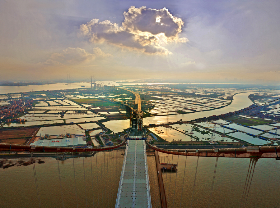 作品說明:2018年5月29日,在虎門二橋工地的坭州(zhou)橋橋塔頂上,順著懸索向西(xi)看,海鷗島立交和(he)大沙橋都在建設(she)中。