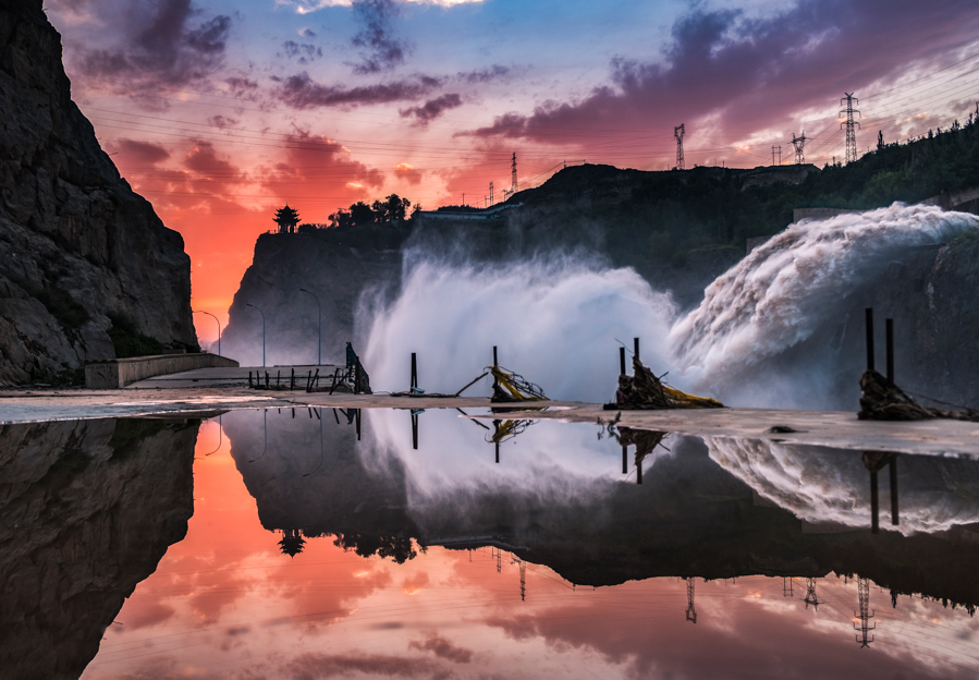 作品說明:黃河水(shui)位持續上漲,劉(liu)家(jia)峽開閘泄洪(hong),晚霞襯(chen)托下的美景。