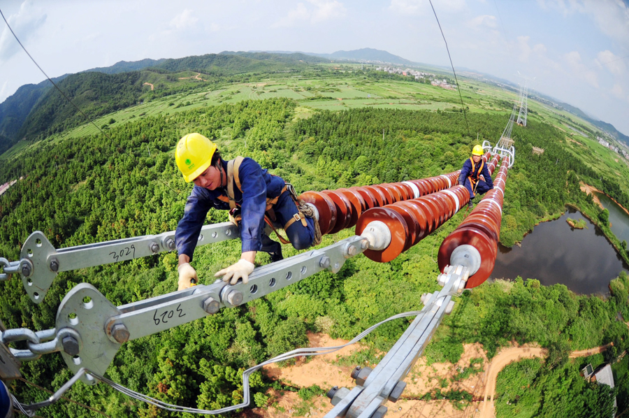 作品說明:2013年7月,江(jiang)西宜春,“西電東(dong)送”溪洛渡(du)-浙江(jiang)±800千(qian)伏特高壓(ya)直流(liu)線路(lu)工程架線施工。
