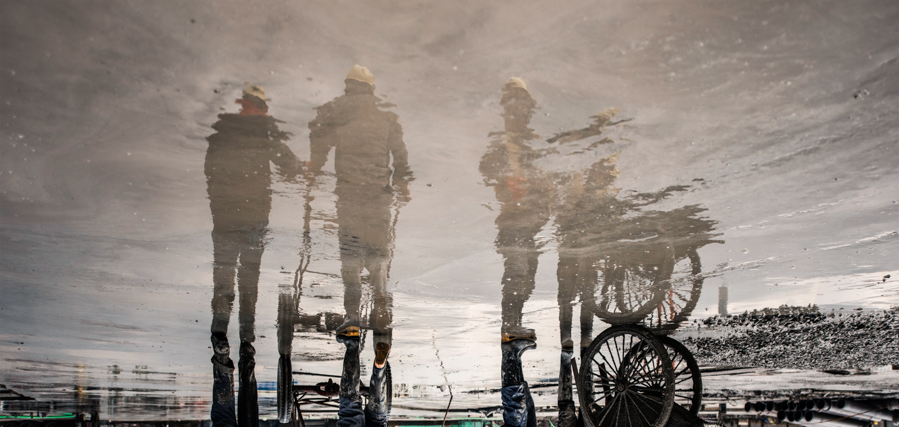作品說明:大雨后工人在泥水中(zhong)干活的倒影。