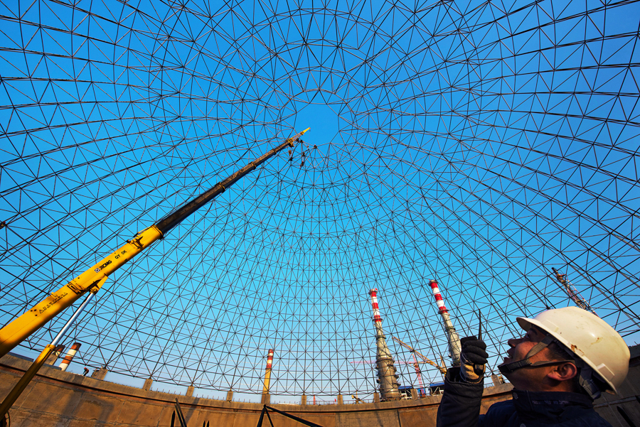 作品說明:2014年12月(yue)2日,中(zhong)國(guo)石化股份有限公(gong)(gong)司(si)齊魯分公(gong)(gong)司(si)熱電廠儲煤(mei)倉(cang)施(shi)工(gong)進(jin)入尾聲,施(shi)工(gong)人員在距地(di)面60余米的高空進(jin)行穹頂(ding)合攏作業。